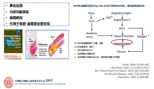 Hcy和RAAS的病理生理基礎(chǔ)為: Hcy和半胱氨酸競爭CSE酶,導(dǎo)致H2S的含量降低,繼而:1、活化血管內(nèi)皮ACE;2、促進(jìn)細(xì)胞內(nèi)腎素合成;3、促進(jìn)腎素從細(xì)胞內(nèi)的分泌,導(dǎo)致循環(huán)腎素水平增加。
