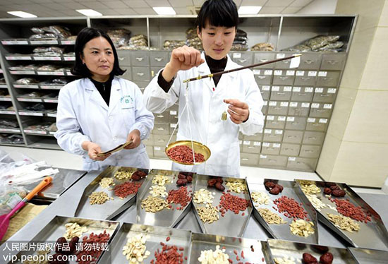 2016年12月20日,安徽省亳州市人民醫(yī)院中藥房的醫(yī)務人員在為市民配制進補用的中草藥。(劉勤利/人民圖片)