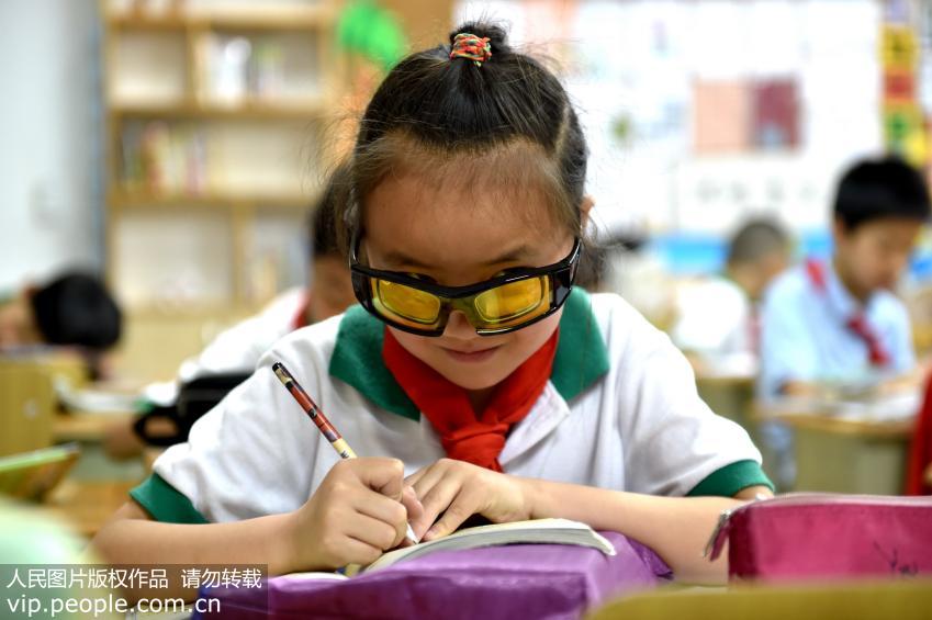 2016年5月31日,杭州一名小學(xué)生戴著據(jù)稱可以治療近視的眼鏡在上課。