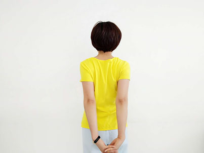 ②兩手十指相扣,放在身后,挺直手臂,向內(nèi)扭轉(zhuǎn)腕部,使手掌盡量貼至臀肌處。