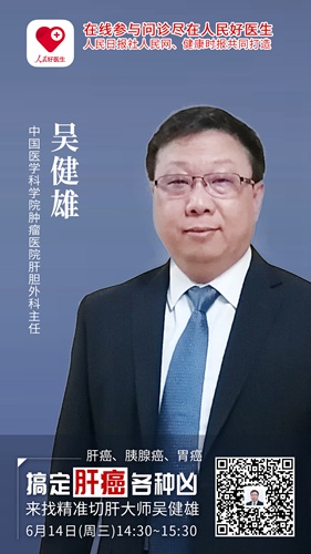 6月14日下午14:30~15:30,精準切肝大師吳健雄將做客由人民日報社人民網(wǎng)、健康時報聯(lián)手打造的“人民好醫(yī)生”客戶端進行視頻、圖文直播,在線解答關于肝癌那些事兒。您的保肝護肝、肝癌治療的相關問題,還在等什么,與大咖零距離互動的機會,好好把握,抓緊來問!