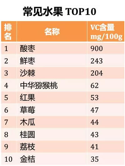 《中國居民膳食營養(yǎng)素參考攝入量》推薦,人體每天需要攝入100mg的維生素C,大概是5-6個鮮棗,1-2個獼猴桃。