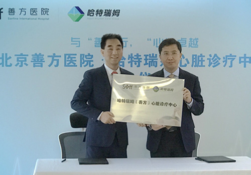 北京善方醫(yī)院院長楊文(左)與哈特瑞姆心臟醫(yī)生集團創(chuàng)始人劉興鵬(右)出席合作授牌儀式
