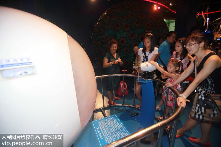 2011年8月4日,在中國科技館里,一個(gè)小朋友正在體驗(yàn)?zāi)M眼底激光治療儀。