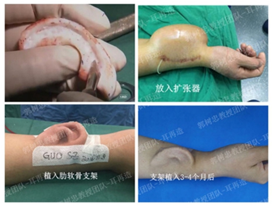 除了換臉術(shù),他也是國內(nèi)著名的耳再造專家,他利用患者胸部肋骨的軟骨“雕刻”出耳朵的輪廓,并預(yù)制在患者的前臂,經(jīng)過幾個(gè)月的“生長”,成為形態(tài)逼真的耳朵,再取下來移植到患者的頭部。目前,他的耳再造技術(shù)已經(jīng)發(fā)展到4.0。