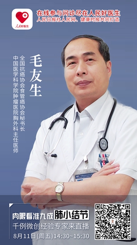 究竟什么是肺部小結(jié)節(jié),又該如何理性應對?8月11日(周五)下午14:30~15:30,擁有千例以上肺癌微創(chuàng)手術(shù)經(jīng)驗、能夠肉眼看準9成以上肺小結(jié)節(jié)的知名胸外科專家、中國醫(yī)學科學院腫瘤醫(yī)院胸外科主任醫(yī)師、胸外二病區(qū)主任毛友生將做客由人民網(wǎng)和健康時報聯(lián)手打造的“人民好醫(yī)生”客戶端,為您解開肺部小結(jié)節(jié)疾病的“心結(jié)”。