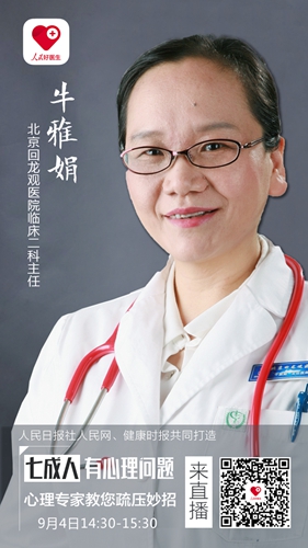 那么,應該如何紓解壓力呢?9月4日(周一)下午2:30-3:30,由人民日報社人民網(wǎng)、健康時報聯(lián)手打造的“人民好醫(yī)生”客戶端邀請到北京回龍觀醫(yī)院臨床二科主任牛雅娟進行視頻、圖文直播,并在線解答廣大網(wǎng)友的問題!