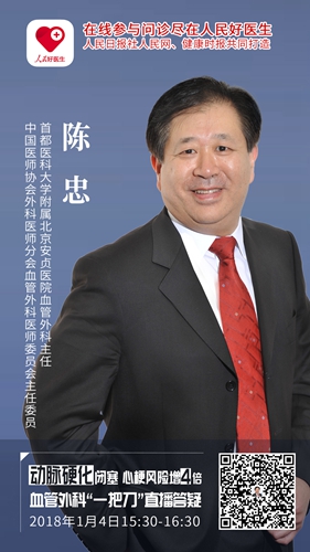 2018年1月4日(周四)下午15:30-16:30,首都醫(yī)科大學(xué)附屬北京安貞醫(yī)院血管外科主任、中國醫(yī)師協(xié)會外科醫(yī)師分會血管外科醫(yī)師委員會主任委員陳忠教授將做客人民日報社人民網(wǎng)、健康時報聯(lián)手打造的“人民好醫(yī)生”客戶端,直播解答各種類型動脈瘤、動脈硬化、動脈狹窄和閉塞等血管疾病相關(guān)問題。
