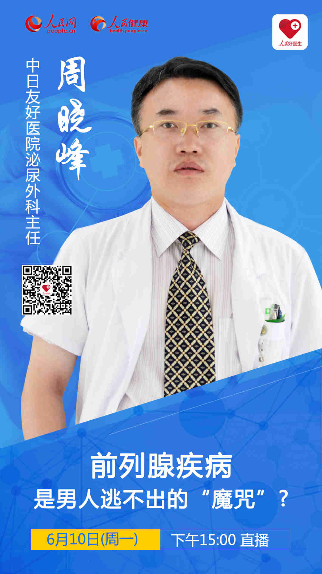 2019年6月10日(周一)15:00,“人民好醫(yī)生”客戶端將邀請(qǐng)中日友好醫(yī)院泌尿外科主任周曉峰進(jìn)行視頻和圖文直播,提高人們對(duì)前列腺疾病的認(rèn)識(shí),做到早期診斷和及時(shí)治療,并在線解答廣大網(wǎng)友相關(guān)問題,千萬(wàn)不要錯(cuò)過!
