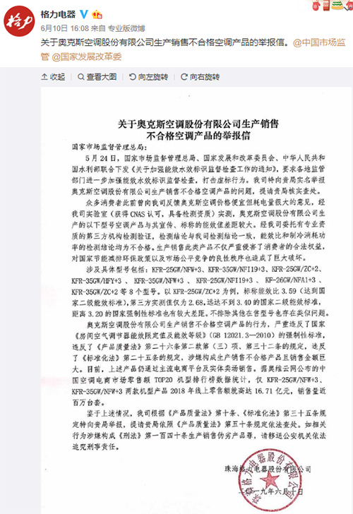 10日下午,格力在官方微博發(fā)布《關(guān)于奧克斯空調(diào)股份有限公司生產(chǎn)銷售不合格空調(diào)產(chǎn)品的舉報(bào)信》稱:“眾多消費(fèi)者此前曾向我司反饋奧克斯空調(diào)價(jià)格便宜但耗電量很大的意見。經(jīng)我司實(shí)驗(yàn)室(獲得CNAS認(rèn)可,具備檢測資質(zhì))實(shí)測,奧克斯空調(diào)多型號產(chǎn)品與其宣傳、標(biāo)稱的能效值差距較大。經(jīng)我司委托有專業(yè)資質(zhì)的第三方機(jī)構(gòu)檢測驗(yàn)證,檢測結(jié)果與我司檢測結(jié)論一致,能效比和制冷消耗功率檢測均為不合格。生產(chǎn)銷售此類產(chǎn)品不僅嚴(yán)重侵害了消費(fèi)者的合法權(quán)益,對國家節(jié)能減排環(huán)保政策及市場公平競爭的良性秩序也造成了巨大破壞。”