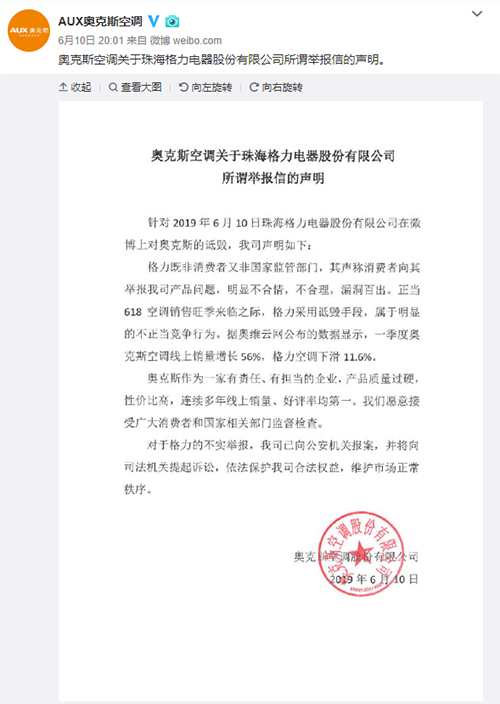 格力舉報(bào)奧克斯引國家市場監(jiān)管總局關(guān)注 奧克斯稱已報(bào)案