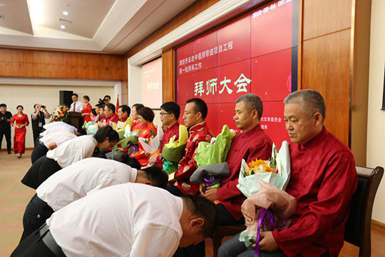 醫(yī)院重視中醫(yī)藥文化傳承, 跟師學員向老師鞠躬行拜師禮