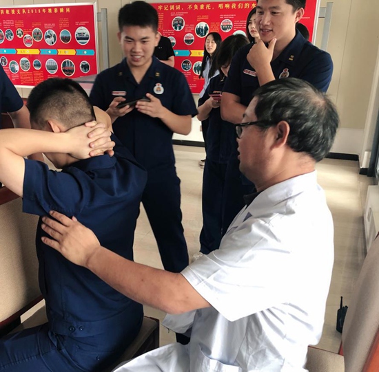 醫(yī)生為消防指戰(zhàn)員進行推拿按摩