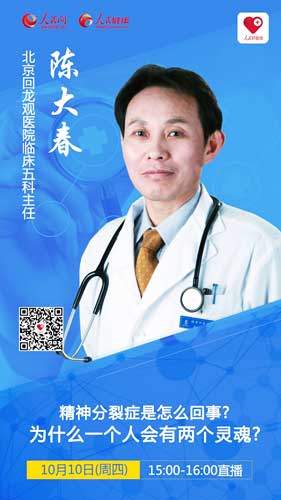 2019年10月10日(周四)下午15:00,“人民好醫(yī)生”客戶(hù)端將邀請(qǐng)北京回龍觀(guān)醫(yī)院臨床五科主任,北京大學(xué)醫(yī)學(xué)部教授陳大春進(jìn)行視頻和圖文訪(fǎng)談,為您解答怎樣才算精神分裂癥?有沒(méi)有先兆?確診后該如何進(jìn)行治療?敬請(qǐng)關(guān)注!