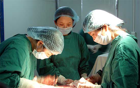 上班第一天,濰坊援川醫(yī)療隊隊員張榮玲、杜欣瑩及北川縣醫(yī)院年輕醫(yī)生合作做了一臺剖宮產,圖正指導縣醫(yī)院年輕醫(yī)師手術。