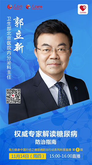 2019年11月14日 周四15:00-16:00,衛(wèi)生部北京醫(yī)院內(nèi)分泌科主任、中華醫(yī)學(xué)會糖尿病學(xué)分會候任主委郭立新教授將在“人民好醫(yī)生”客戶端進(jìn)行視頻、圖文直播,并在線解答關(guān)于糖尿病防治方面的問題,千萬不要錯過!