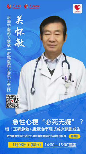 那么心急梗死一旦發(fā)生就意味著死亡嗎?心?梢酝ㄟ^治療康復嗎?哪些因素會造成心梗的發(fā)生呢?2020年1月3日(周五)14:00-15:00,河南中醫(yī)藥大學第一附屬醫(yī)院心臟中心主任關(guān)懷敏將在“人民好醫(yī)生”客戶端進行視頻、圖文直播,并在線解答關(guān)于心肌梗死后康復治療的相關(guān)問題,大家千萬不要錯過。