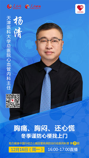 2019年12月16日(周一)下午16:00-17:00,“人民好醫(yī)生”客戶端將邀請天津醫(yī)科大學(xué)總醫(yī)院心血管內(nèi)科主任楊清教授進(jìn)行視頻和文字直播,給大家講解冬季心梗的預(yù)防和急救方法,還可以在線向楊教授提問,幫大家解疑答惑,記得提前下載“人民好醫(yī)生”APP,觀看健康直播。