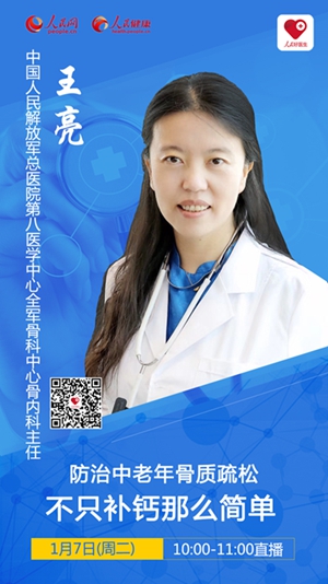 2020年1月7日(周二)上午10:00,“人民好醫(yī)生”客戶端將邀請中國人民解放軍總醫(yī)院第八醫(yī)學中心全軍骨科中心骨內(nèi)科主任王亮進行視頻和圖文訪談,為您解答骨質(zhì)疏松科普知識,以及老年骨質(zhì)疏松診療和防治,敬請關(guān)注。