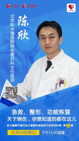 2020年01月15日(周三)下午15:00,“人民好醫(yī)生”客戶端將邀請(qǐng)北京積水潭醫(yī)院燒傷整形科主任醫(yī)師陳欣進(jìn)行視頻和圖文直播,結(jié)合燒傷的分類,科普燒傷的急救、評(píng)估、治療及術(shù)后日常護(hù)理,并在線解答廣大網(wǎng)友相關(guān)問題,千萬不要錯(cuò)過。