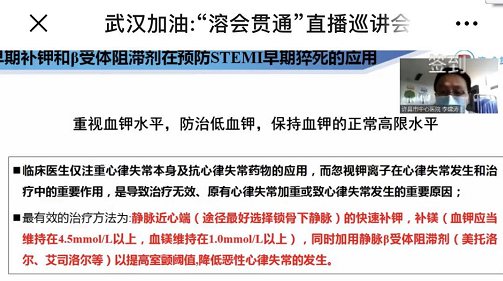 張小杰在會上講到,新冠肺炎疫情發(fā)生以來,有很多醫(yī)護人員也被感染,作為醫(yī)護人員,一定要做好防護,保護好自己,才能救治更多的患者。隨后,張小杰分享了一例在疫情防控下的典型急性心肌梗死患者救治案例,提出在救治過程中應優(yōu)先排查是否有新冠肺炎高發(fā)區(qū)旅行史及可疑人員接觸史,還應考慮冠脈痙攣引起的心肌梗死,救治過程應根據(jù)患者病情進展適當調(diào)整救治策略,兼顧其他發(fā)病因素可能性。