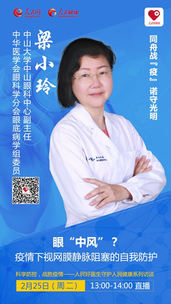 2020年2月25日(周二)13:00-14:00,“人民好醫(yī)生”客戶端將邀請(qǐng)中華醫(yī)學(xué)會(huì)眼科學(xué)分會(huì)眼底病學(xué)組委員、中山大學(xué)中山眼科中心副主任梁小玲進(jìn)行視頻直播,與您探討疫情下視網(wǎng)膜靜脈阻塞的自我防護(hù)。