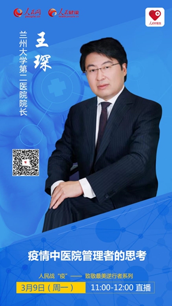 2020年3月9日(周一)11:00-12:00,“人民好醫(yī)生”客戶(hù)端將邀請(qǐng)?zhí)m州大學(xué)第二醫(yī)院院長(zhǎng)王琛進(jìn)行視頻直播,與您分享疫情中醫(yī)院管理者的思考。王琛院長(zhǎng)在剛剛過(guò)去的2019年榮獲第十三屆中國(guó)醫(yī)院院長(zhǎng)年會(huì)2018-2019“最具領(lǐng)導(dǎo)力中國(guó)醫(yī)院領(lǐng)導(dǎo)者”稱(chēng)號(hào)。讓我們與這位最具創(chuàng)新力管理者,現(xiàn)在正堅(jiān)守奮戰(zhàn)在抗擊疫情一線的臨床專(zhuān)家,探討碰撞新的火花。