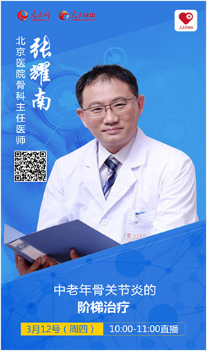 隨著我國人口不斷老齡化,中老年骨關(guān)節(jié)炎的發(fā)病率和患病率都呈逐年遞增的趨勢,老年人因身體機能老化,越是高齡患病風(fēng)險越高,這給患者的生活質(zhì)量和身體健康造成了較大的影響。2020年3月12日(周四)10:00-11:00,“人民好醫(yī)生”客戶端將邀請北京醫(yī)院骨科主任醫(yī)師張耀南進行視頻直播,以膝骨關(guān)節(jié)為例為您講解治療方案以及如何預(yù)防中老年骨關(guān)節(jié)損傷。