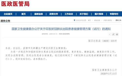 人民網(wǎng)北京3月16日電(董童)隨著治愈出院患者的不斷增多,為做好出院患者的隔離管理、隨訪復診、健康監(jiān)測、康復管理等一攬子工作,促進新冠肺炎全流程管理、促進患者全面康復,國家衛(wèi)生健康委于13日在官網(wǎng)發(fā)布了《新冠肺炎出院患者健康管理方案(試行)》(以下簡稱“方案”)。