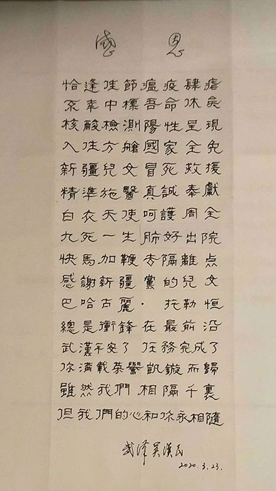 巴哈古麗用舞蹈架起了與患者心與心溝通的橋梁,在醫(yī)療隊(duì)員和患者的共同努力下,治愈人數(shù)日漸攀升,巴哈古麗也同患者們成了好朋友。巴哈古麗說(shuō):“我們把從新疆帶來(lái)的紅棗、薄皮核桃、葡萄干等等送給了患者。同時(shí)也收到了患者送來(lái)的感謝信。”一位福建的大學(xué)老師專門為她畫了幅長(zhǎng)達(dá)一米八的畫,讓她倍受感動(dòng)和震撼。