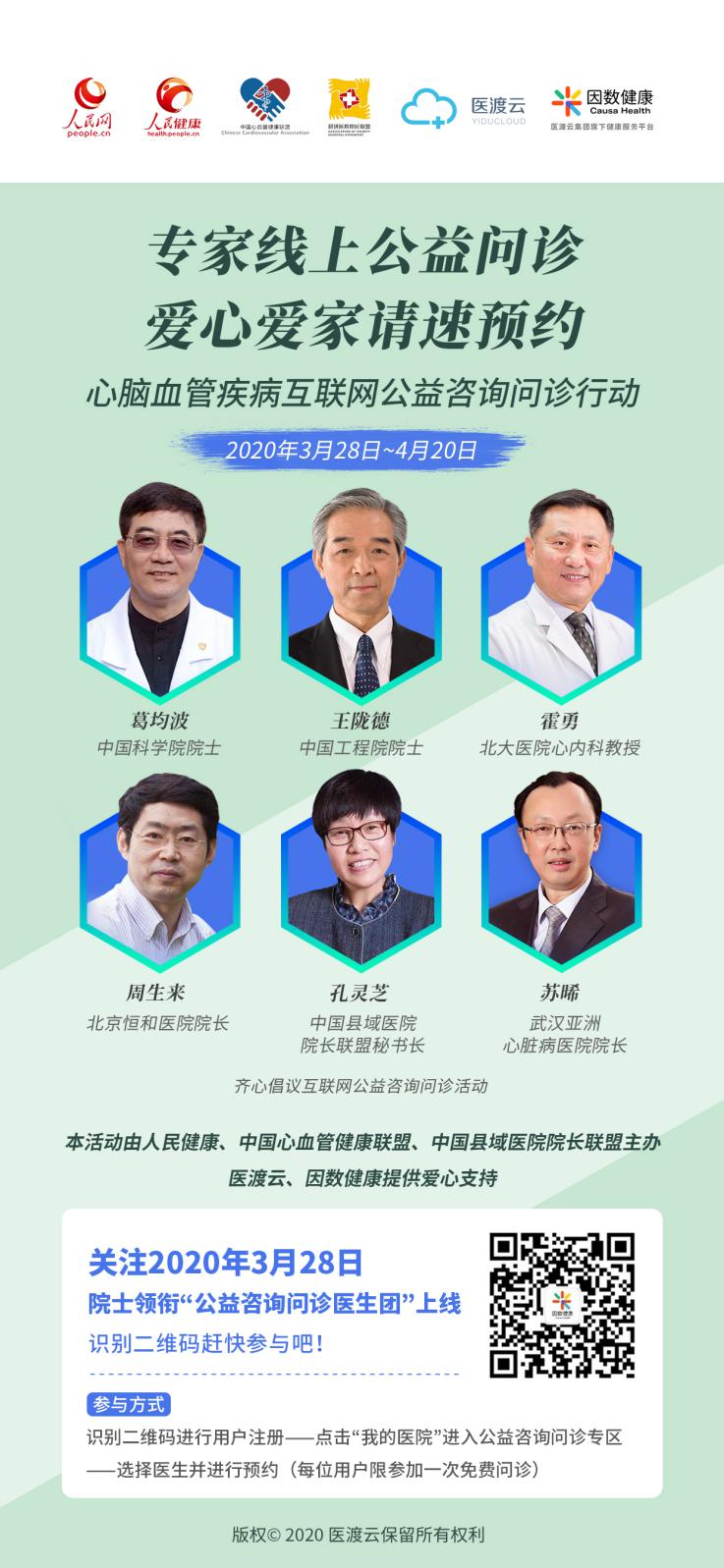 據(jù)了解,此次心腦血管疾病互聯(lián)網(wǎng)健康公益咨詢問診行動,在中國科學(xué)院、中國心血管健康聯(lián)盟主席、上海復(fù)旦大學(xué)附屬中山醫(yī)院葛均波院士號召下,中國縣域醫(yī)院院長聯(lián)盟執(zhí)行主席、北大醫(yī)院心內(nèi)科、心臟中心霍勇教授,江蘇省人民醫(yī)院孔祥清教授,廣東省南方醫(yī)院吳平生教授,中國心血管健康聯(lián)盟秘書長方唯一教授,北京協(xié)和醫(yī)院王崇慧教授,北京天壇醫(yī)院徐東教授,武漢協(xié)和醫(yī)院黃愷教授,蘭州大學(xué)第一醫(yī)院張鉦教授等專家已經(jīng)應(yīng)邀參加并初步確認(rèn)了咨詢問診時間,同時更多專家將陸續(xù)加入到這次公益咨詢問診行動中。