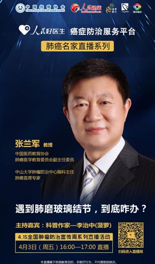 2020年4月3日(周五) 16:00-17:00,“人民好醫(yī)生”聯(lián)合中國抗癌協(xié)會(huì)推出肺癌名家直播系列第一期,邀請(qǐng)中國醫(yī)藥教育協(xié)會(huì)肺癌醫(yī)學(xué)教育委員會(huì)副主任委員、中山大學(xué)腫瘤防治中心胸科主任張?zhí)m軍教授進(jìn)行視頻直播,一同探討遇到肺磨玻璃結(jié)節(jié)該如何治療。