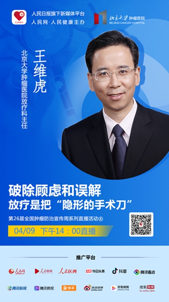 4月9日(周四)14:00,“人民好醫(yī)生”客戶端將邀請北京大學(xué)腫瘤醫(yī)院放療科主任王維虎教授進(jìn)行視頻直播,為大家講解放療的基本知識以及腫瘤患者如何選擇放療。