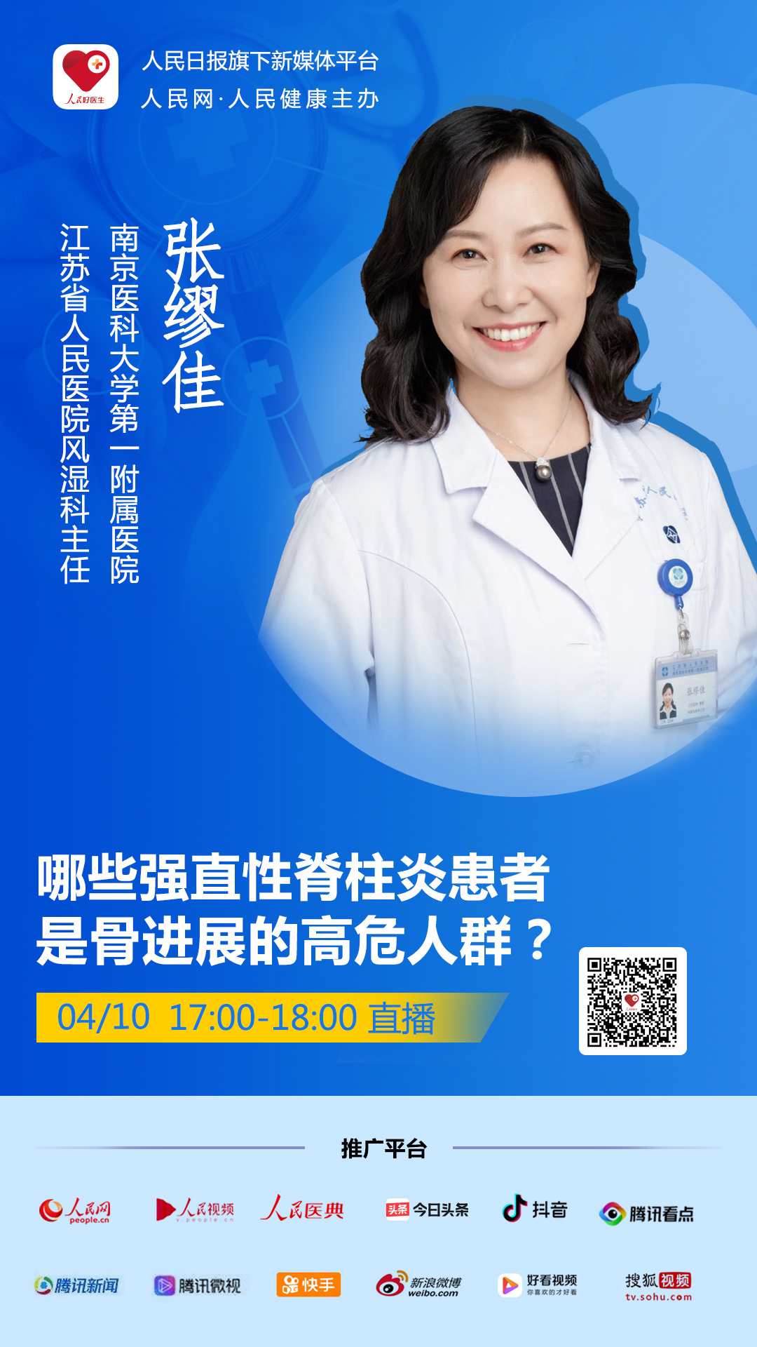 2020年4月10日(星期五)17:00-18:00,“人民好醫(yī)生”客戶端將邀請南京醫(yī)科大學(xué)第一附屬醫(yī)院江蘇省人民醫(yī)院風(fēng)濕科主任 張繆佳進(jìn)行視頻直播,與您探討哪些強(qiáng)直性脊柱炎患者是骨進(jìn)展的高危人群。