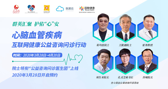 在抗擊疫情仍不可松懈的特殊時期,為降低頻繁往返醫(yī)院可能存在交叉感染的風(fēng)險(xiǎn),幫助解決心腦血管疾病輕癥、非危急重癥等患者的復(fù)診、用藥、居家護(hù)理等需求,由人民網(wǎng)指導(dǎo),人民健康、中國心血管健康聯(lián)盟、中國縣域醫(yī)院院長聯(lián)盟聯(lián)合主辦,由葛均波院士、王隴德院士、霍勇教授、周生來教授、孔靈芝教授、蘇晞教授等著名心腦血管疾病專家聯(lián)袂領(lǐng)銜并發(fā)起倡議,醫(yī)渡云集團(tuán)旗下因數(shù)健康在線醫(yī)療健康服務(wù)平臺特別推出“心腦血管疾病互聯(lián)網(wǎng)健康公益咨詢問診行動”。