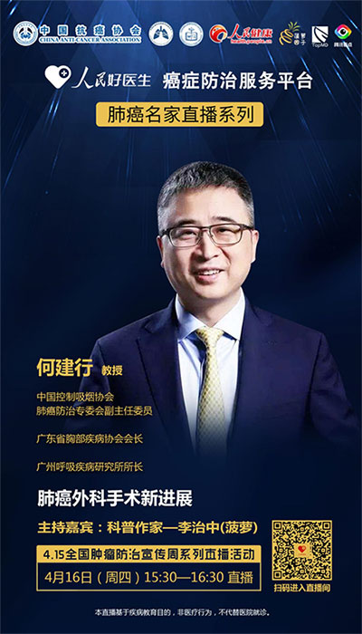 2020年4月16日(周四)15:30-16:30,人民好醫(yī)生客戶端邀請到中國控制吸煙協(xié)會肺癌防治專委會副主任委員、廣東省胸部疾病協(xié)會會長、廣州呼吸疾病研究所所長何建行進行視頻直播訪談,在線分享肺癌外科手術新進展。