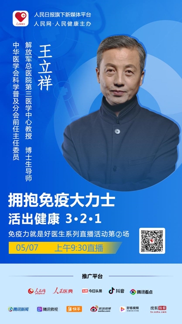 人民日報社旗下新媒體“人民好醫(yī)生”客戶端特別策劃“免疫力就是好醫(yī)生系列直播活動”。2020年5月7日上午9:30,解放軍總醫(yī)院第三醫(yī)學中心博士生導(dǎo)師,中華醫(yī)學會科學普及分會前任主任委員王立祥教授將進行系列活動的第二場視頻訪談,歡迎屆時收看。