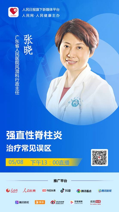 強(qiáng)直性脊柱炎是以侵犯骶髂關(guān)節(jié)和脊柱為主要臨床表現(xiàn)的炎癥性關(guān)節(jié)炎,常見于年輕男性,對(duì)患者的勞動(dòng)能力、形象和生活都會(huì)帶來(lái)一定程度的困擾。強(qiáng)直性脊柱炎主要侵犯人體脊柱,早期主要癥狀為下腰部疼痛,嚴(yán)重時(shí)會(huì)出現(xiàn)如背部僵直這樣的癥狀,故稱之為強(qiáng)直性脊柱炎。但目前,人們對(duì)強(qiáng)直性脊柱炎的治療認(rèn)識(shí)存在諸多誤區(qū),導(dǎo)致治療依從性差和效果不佳等情況出現(xiàn),如該病究竟是否可以根治,是否存在特效藥,偏方是否可信等?2020年5月8日(星期五)13:00-14:00,“人民好醫(yī)生”客戶端將邀請(qǐng)廣東省人民醫(yī)院風(fēng)濕科行政主任張曉教授進(jìn)行視頻直播,與您探討強(qiáng)直性脊柱炎治療的常見誤區(qū)有哪些。