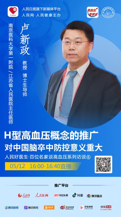 2020年5月12日(周二)16:00-16:40“人民好醫(yī)生”客戶端將邀請南京醫(yī)科大學(xué)第一附院/江蘇省人民醫(yī)院主任醫(yī)師 盧新政教授進(jìn)行視頻直播,深度剖析H型高血壓概念推廣對腦卒中防控的重大意義。