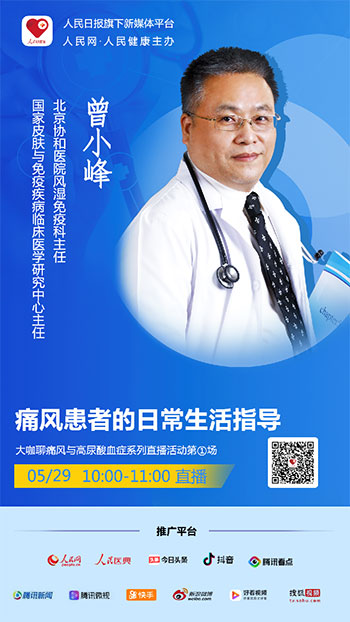 2020年5月29日(周五)10:00-11:00,“人民好醫(yī)生”客戶端將邀請(qǐng)北京協(xié)和醫(yī)院風(fēng)濕免疫科主任、國(guó)家皮膚與免疫疾病臨床醫(yī)學(xué)研究中心主任 曾小峰進(jìn)行視頻直播,為痛風(fēng)患者的日常生活進(jìn)行全面有效的指導(dǎo)。