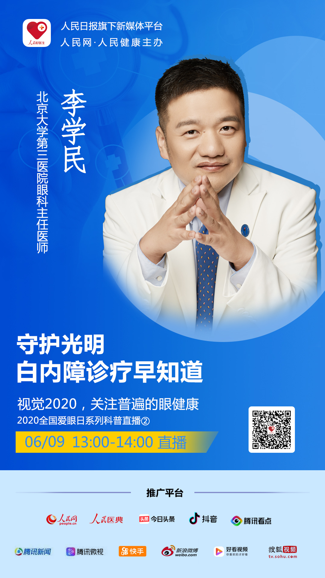 2020年6月9日(周二)13:00-14:00,人民日報社旗下新媒體“人民好醫(yī)生”客戶端將邀請北京大學(xué)第三醫(yī)院眼科主任醫(yī)師李學(xué)民進行視頻直播,帶您了解白內(nèi)障預(yù)防、治療相關(guān)問題,千萬不要錯過。