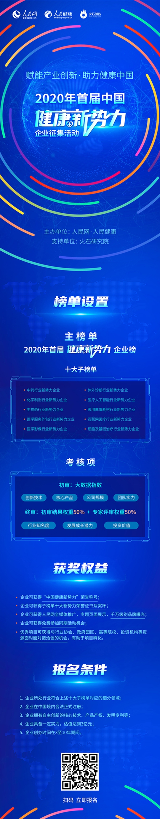 為此,人民網(wǎng)·人民健康,聯(lián)合火石研究院,發(fā)起2020首屆中國(guó)健康新勢(shì)力企業(yè)征集評(píng)選。我們將尋找全國(guó)醫(yī)健產(chǎn)業(yè)潛力企業(yè),探索挖掘中國(guó)大健康發(fā)展新動(dòng)能、新舉措,助力新基建,從而提高全社會(huì)對(duì)新勢(shì)力企業(yè)的關(guān)注支持力度。