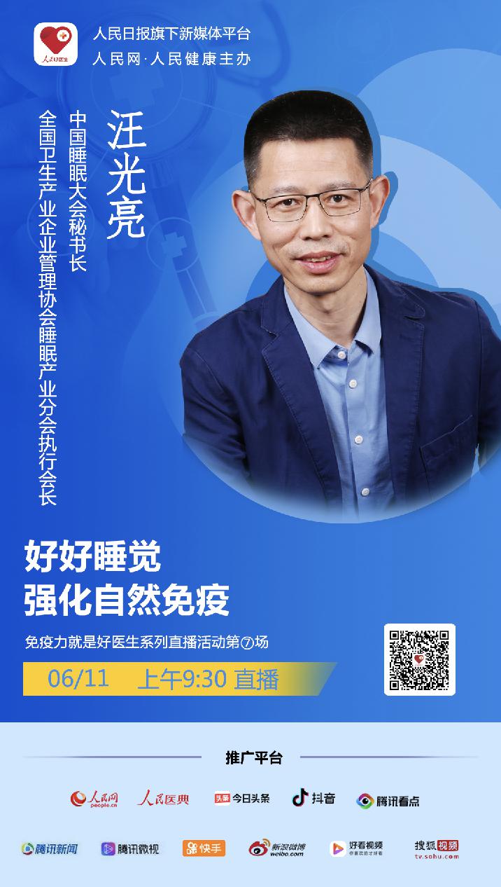 2020年6月11日(周四)上午9:30,人民日報社旗下新媒體“人民好醫(yī)生”客戶端將邀請中國睡眠大會秘書長、全國衛(wèi)生產(chǎn)業(yè)企業(yè)管理協(xié)會睡眠產(chǎn)業(yè)分會執(zhí)行會長汪光亮進(jìn)行視頻訪談,與大家在線分享如何通過調(diào)節(jié)睡眠強(qiáng)化自然免疫。