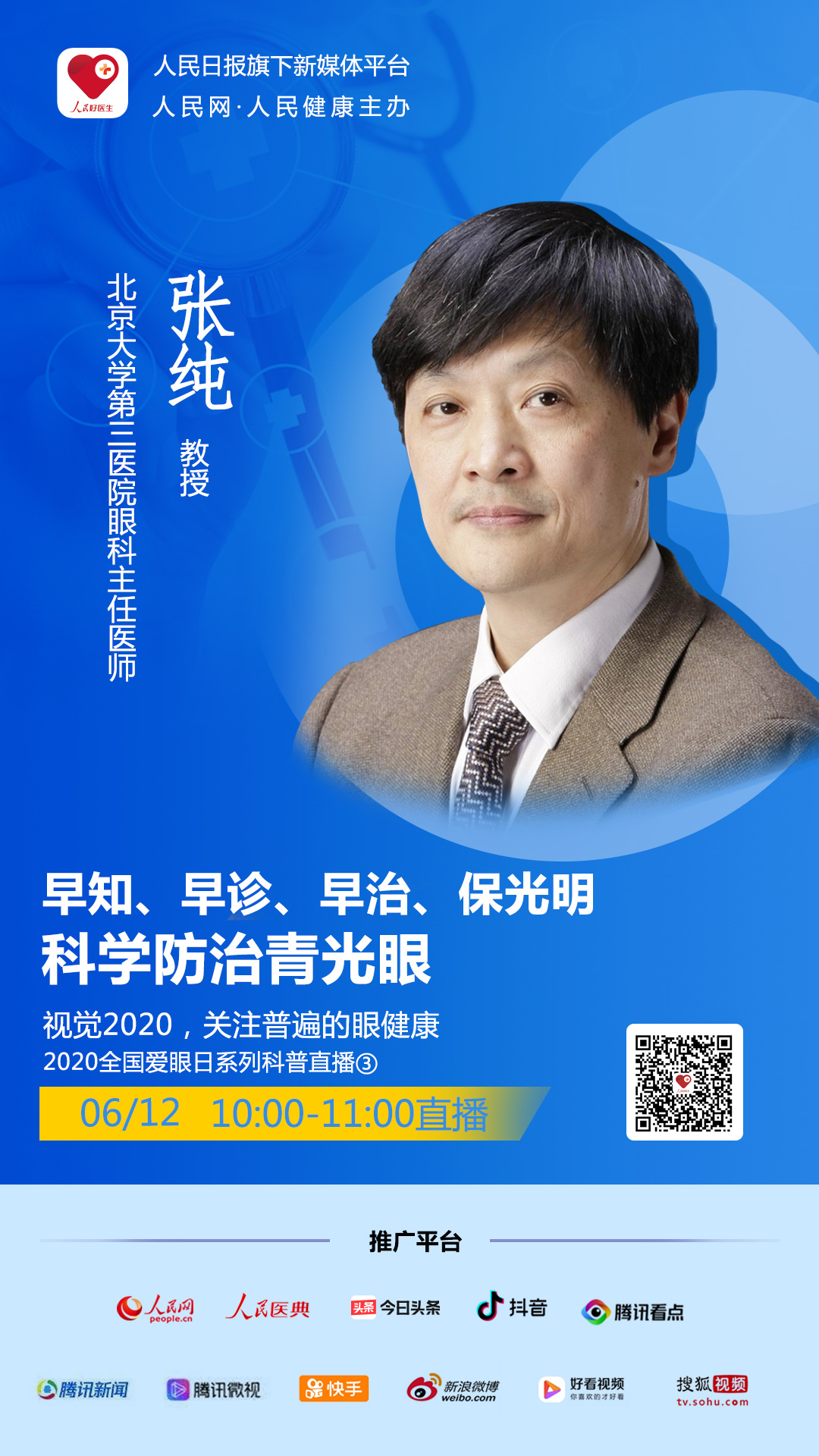 2020年6月12日(周五)10:00-11:00,人民日報社旗下新媒體“人民好醫(yī)生”客戶端將邀請北京大學(xué)第三醫(yī)院眼科主任醫(yī)師 張純教授進行視頻直播,帶您了解青光眼早診早治相關(guān)問題,千萬不要錯過。