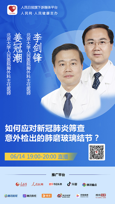 2020年06月14日(周日)19:00-20:00,“人民好醫(yī)生”客戶端將邀請(qǐng)北京大學(xué)人民醫(yī)院胸外科姜冠潮、李劍鋒教授進(jìn)行視頻直播,結(jié)合新冠疫情中,肺部影像學(xué)的特點(diǎn),科普肺部磨結(jié)節(jié)的治療及日常管理,千萬(wàn)不要錯(cuò)過(guò)。