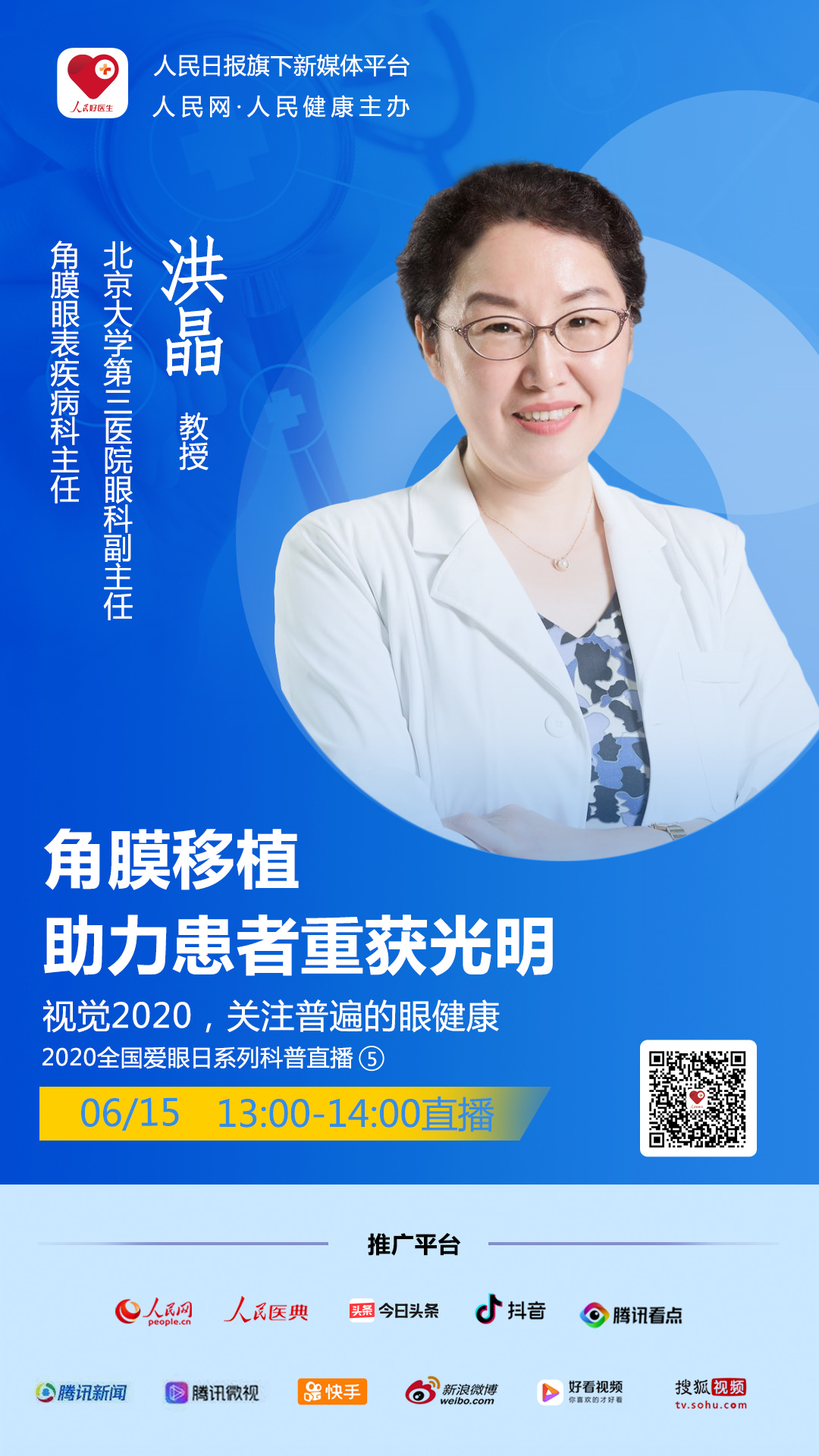 2020年06月15日(周一)13:00-14:00,“人民好醫(yī)生”客戶端將邀請北京大學第三醫(yī)院眼科副主任、角膜眼表疾病科主任洪晶教授進行視頻直播,結合眼角膜結構特點,科普角膜常見疾病及角膜移植相關知識,千萬不要錯過。
