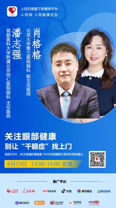 2020年6月19日(周五)13:00-14:00,“人民好醫(yī)生”客戶(hù)端將邀請(qǐng)首都醫(yī)科大學(xué)附屬北京同仁醫(yī)院眼科主任醫(yī)師潘志強(qiáng),北京大學(xué)第三醫(yī)院眼科副主任醫(yī)師肖格格一起和大家分享干眼癥的相關(guān)話題。