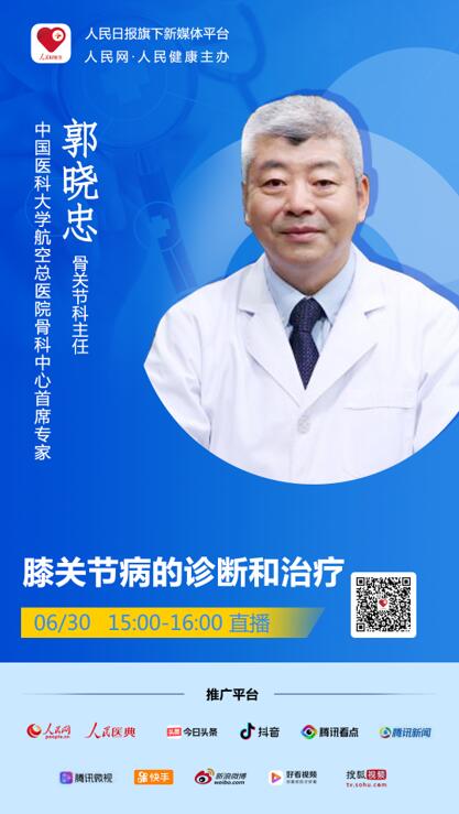 2020年6月30日 周二 15:00-16:00,人民日報社旗下新媒體“人民好醫(yī)生”客戶端將邀請中國醫(yī)科大學(xué)航空總醫(yī)院骨科中心首席專家、骨關(guān)節(jié)科主任郭曉忠進(jìn)行視頻直播,為大家解答膝關(guān)節(jié)病的診斷和治療相關(guān)問題,千萬不要錯過。