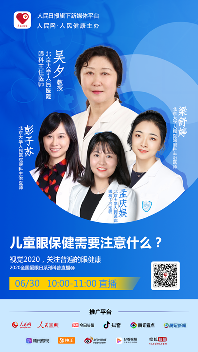 2020年06月30日(周二)10:00-11:00,“人民好醫(yī)生”客戶端將邀請北京大學人民醫(yī)院眼科主任醫(yī)師吳夕教授一行進行視頻直播,為大家詳細講解兒童近視、弱視與斜視的診療,科普早治療、早恢復的重要性,千萬不要錯過。