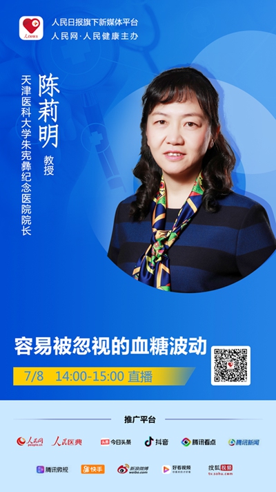 2020年7月8日 周三 14:00-15:00,值“餐后血糖7.8”健康宣傳日之際,人民日?qǐng)?bào)社旗下新媒體“人民好醫(yī)生”客戶端將邀請(qǐng)?zhí)旖蜥t(yī)科大學(xué)朱憲彝紀(jì)念醫(yī)院院長(zhǎng)陳莉明教授進(jìn)行視頻直播,為廣大糖尿病患者解答餐后血糖與血糖波動(dòng)相關(guān)問(wèn)題,千萬(wàn)不要錯(cuò)過(guò)。